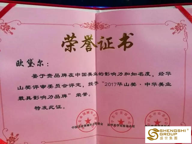 最新喜報(bào)!盛世集團(tuán)歐黛爾品牌榮獲2017華山獎(jiǎng)-中華美業(yè)最具影響力品牌!